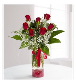 silindir vazoda yeşillikler içerisinde 7 kırmızı gül